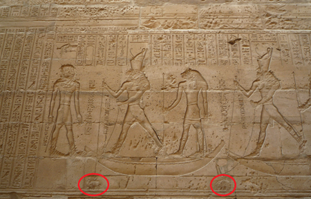 บนกำแพงวิหาร จะแสดงภาพของเทพฮอรัส มีร่างกายเป็นคน แต่มีศรีษะเป็นนกอินทรี ยืนอยู่บนเรือ ในขณะที่เทพเซธ จะอยู่ในรูปของฮิปโปโปเตมัส อยู่ใต้น้ำ