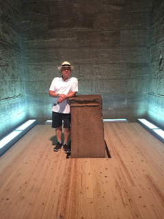 (แท่นที่ประดิษฐานเรือซึ่งเป็นพาหนะของเทพี ไอซิส ในวิหารฟิเลย์ กับผู้เขียน)