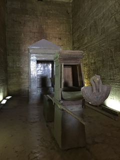 (ศาลเจ้าซึ่งอยู่ข้างหลัง และ แท่นที่วางเรืออันเป็นพาหนะของเทพเจ้าฮอรัส ที่วิหารเอ็ดฟู ล้วนทำด้วยหินแกรนิต)