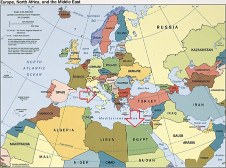 (แผนที่แสดงที่ตั้งของกรุงโรม (ศรชี้ข้างบน) และ อเล็กซานเดรีย ของอียิปต์(ศรชี้ข้างล่าง) ภาพจากกูเกิ้ลแมพ)